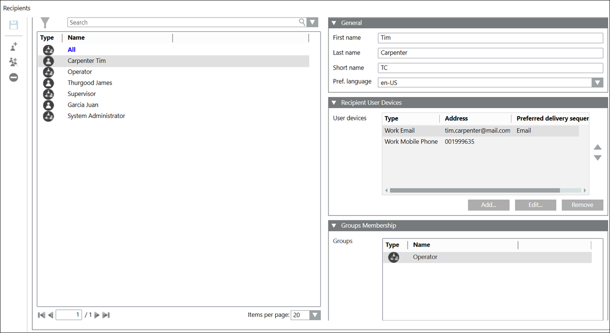 1. In System Browser, select Notification > Recipients.