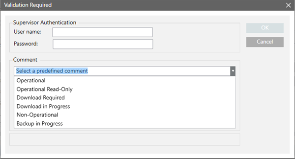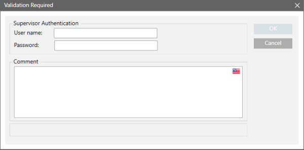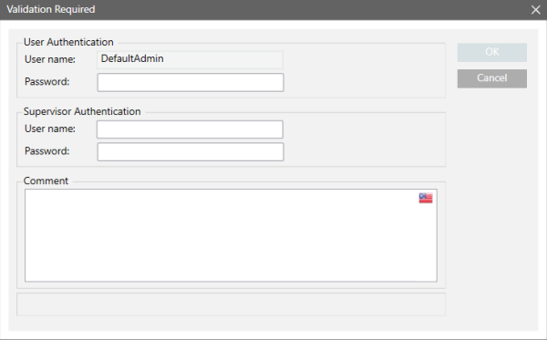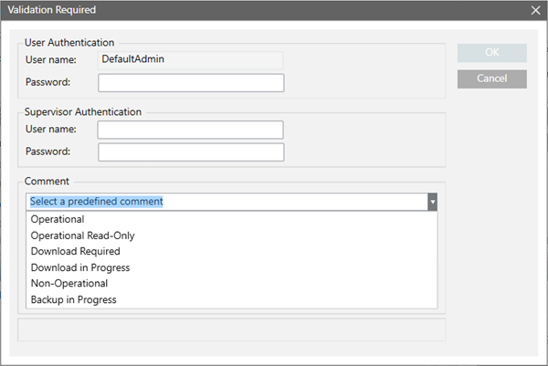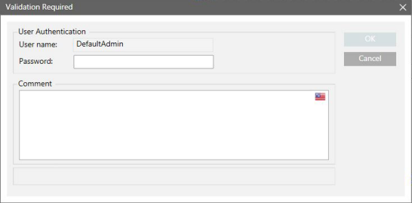 This section and the next section show two dialog boxes for each validation profile. The first dialog box requires a user-entered comment. The second dialog box requires a selection from a predefined list of comments. The actual dialog box that displays when you change or command a validated object depends on whether predefined comments have been configured for the object. If predefined comments were not configured, you will see the first dialog box. If predefined comments were configured, you will see something similar to the second dialog box.