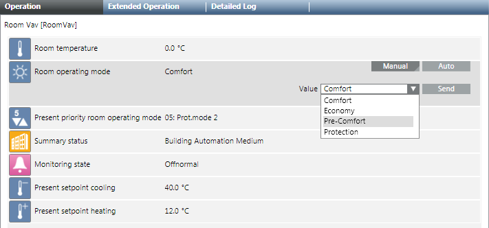 - The Operation tab displays properties Room operating mode and Comfort button.