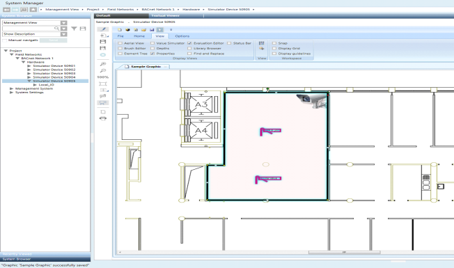 Management station graphics can contain cameras or monitoring devices to which objects, such as fire sensors, ceiling sprinklers, temperature sensors, etc. are associated. In Runtime mode or in the Graphics Viewer, you can opt to view the coverage area of the cameras or monitoring devices on your graphic, and thereby identify the view associated with the objects.