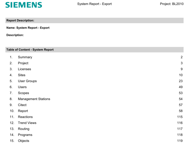 Migration package: A package with graphics, trend views, trend data, log data, and subsystem data is generated together with the system report (PDF) in a zip file. You can set the data to be included in this package for a specific project.