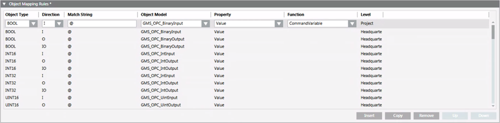 You can add a new rule after the one selected, copy the selected rule and add the copy after the selected rule, remove and move up or down the selected rule. Note that rules are evaluated top-down. Consequently, if more than one rule can be applied to the same OPC item, the rule on top is the one that will be used to import the OPC item.