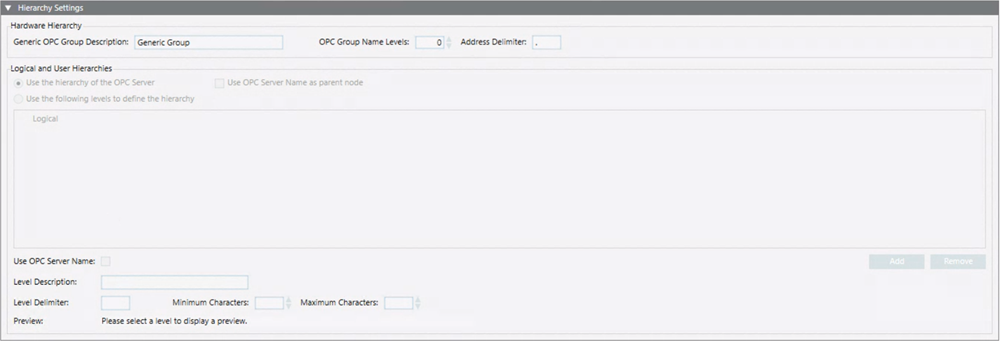 For the hardware (physical) hierarchy that will be imported into Management View, you can specify the name to use for the generic OPC group, the number of levels of the OPC Items address from which the OPC groups name will be generated, and the characters to be used as delimiters.