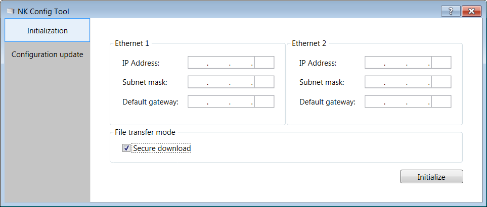 - The File transfer mode check box is set to Secure download by default (encrypted data transmission on TCP port 20500). If you have a local and safe connection to NK823x, you may want to deselect the check box and apply a faster FTP passive mode.