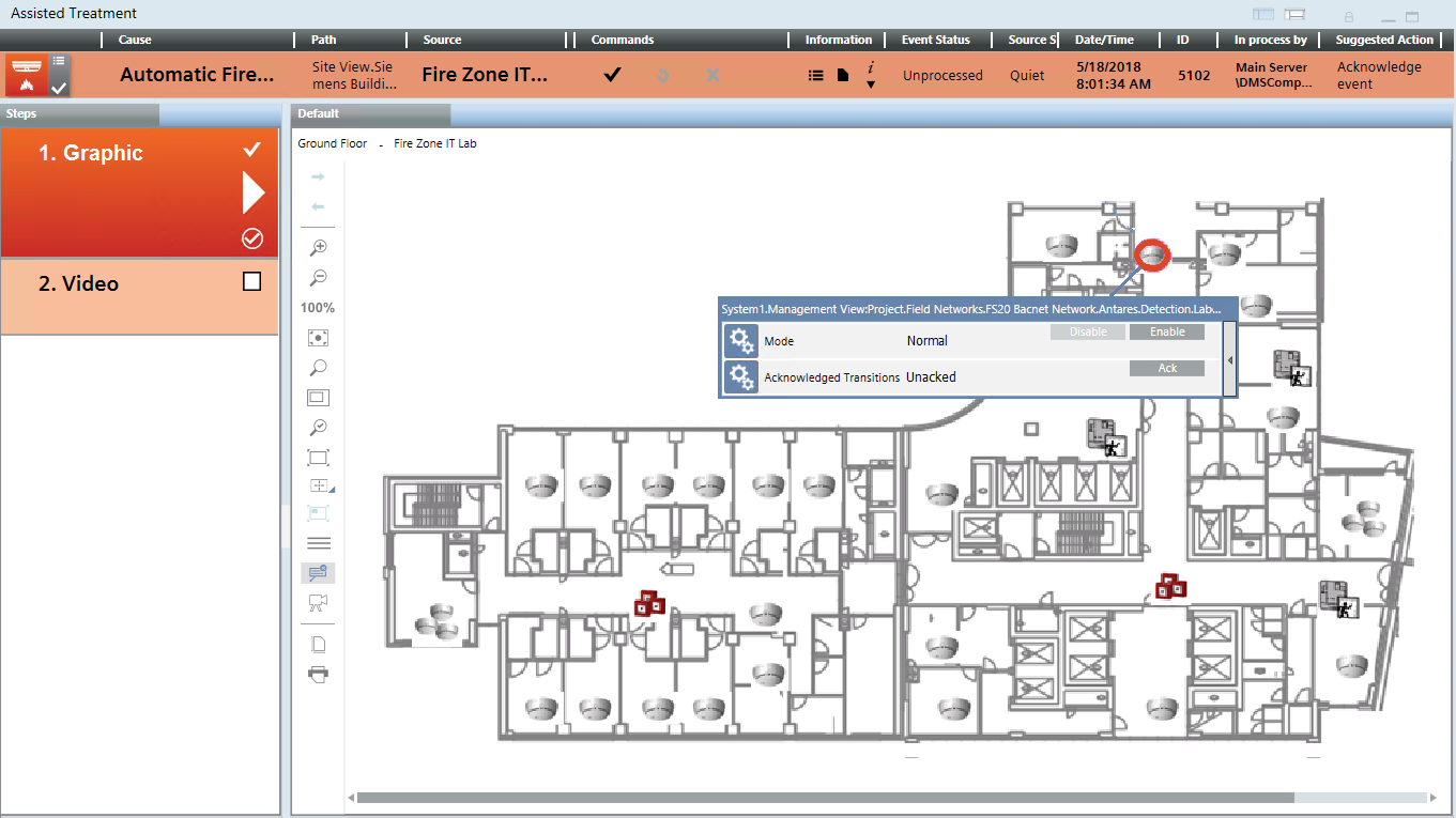 The symbols of the alarmed objects show a colored circle and the Status and Command window.