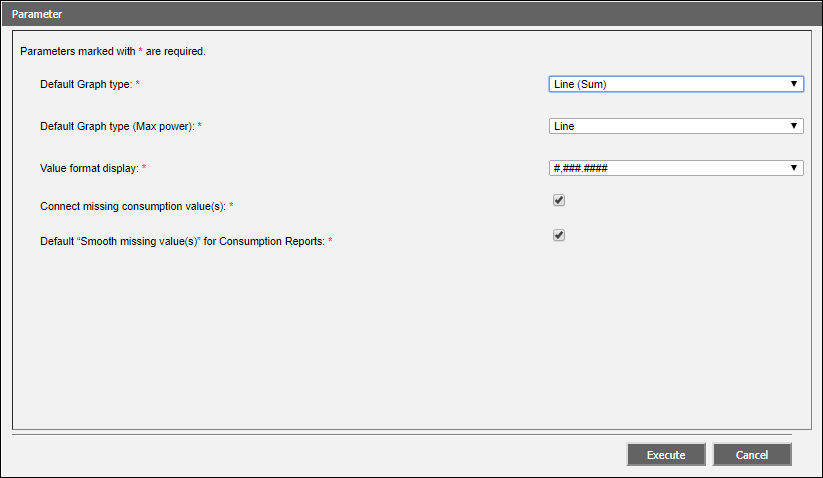 You can connect and smooth these missing values using the Connect missing consumption value(s) check box in the Parameter dialog box accessed by clicking Edit next to Energy Reports Settings on the Configuration Page and Smooth missing value(s) check box in the Parameter dialog box accessed on executing a consumption report. For information on executing a report, see Executing Energy Reports.