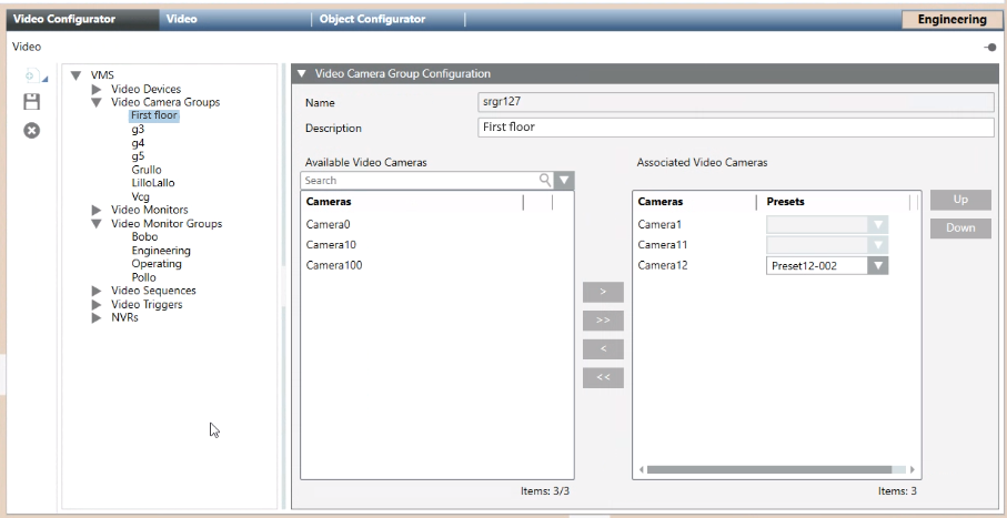 - In the Video Configurator tab, select VMS > Video Camera Groups > [camera group].