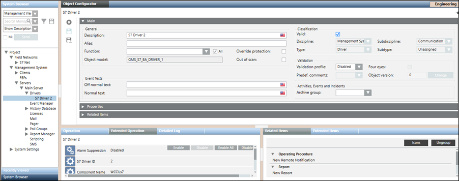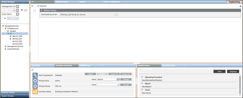 The S7 network workspace allows you to configure the network settings such as associating the S7 driver to the network and saving the association. The properties associated with the selected network display in the Operation tab or Extended Operation tab. You can also change the value of the poll interval. By default, this value is set to 0 ms. In order to delete the network, you must click Delete