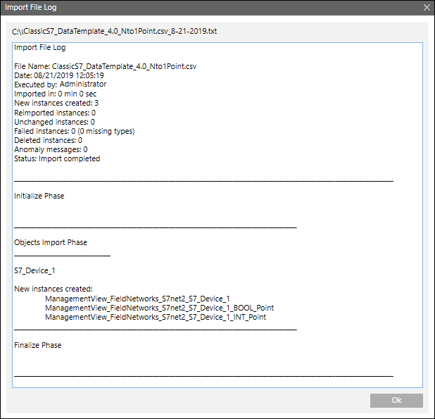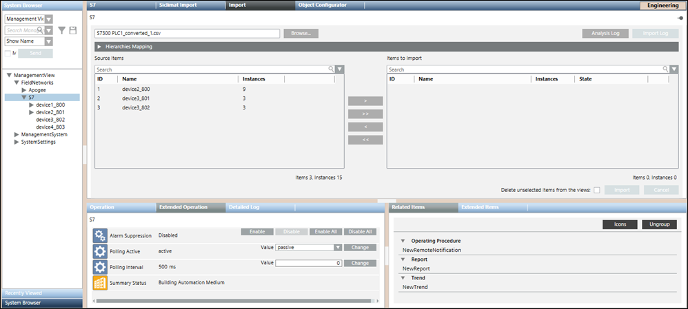 This operation also causes the Management View hierarchy to add objects and internal nodes (points), and delete internal objects. The import process deletes any S7 devices that are no longer present in the CSV file (only if the Delete unselected items from the views check box is selected).