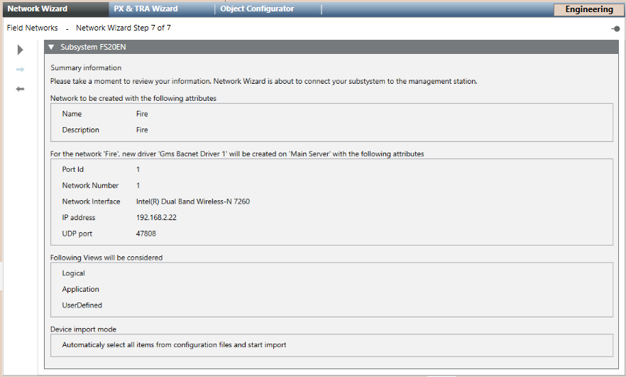 - In the Network Wizard tab, in Available subsystems, select the type of fire subsystem.