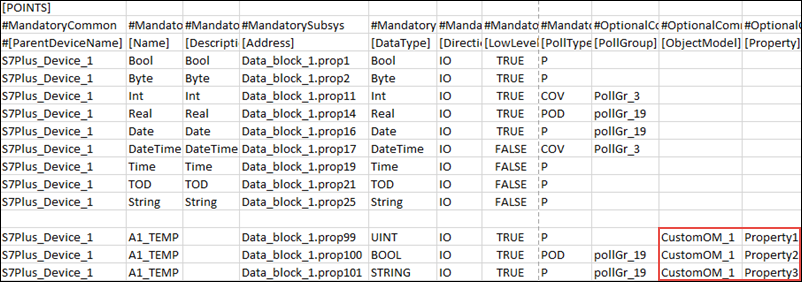 DataType1) | Data type of the S7 PLUS point. For Standard Object Model import, it is a CSV datatype. It is used along with [Direction] to derive the Transformation Type and standard object model of a point using import rules. Valid CSV datatypes include, Bool, Byte, Word, DWord, USint, UInt, UDInt, SInt, Int, DInt, Real, Date, DateTime, Time, TOD, S5Time, String, WString, ENUM. For N to 1 mapping, it is the Transformation Type (datatype of the property on the device). Valid transformation types include, Bool, Byte, Word, DWord, USint, UInt, UDInt, SInt, Int, DInt, Real, Date, DateTime, Time, TOD, S5Time, String, WString. |