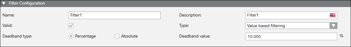 Deadband value | Applicable for value based filtering filter group type. It can be a percentage or absolute value depending on the selected deadband type. |