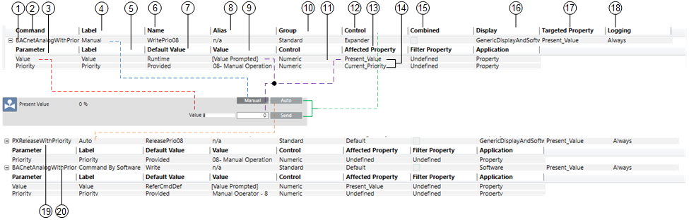 2 | Command | Command type for selected property (for example, BACnetAnalogWithPriority). | |
