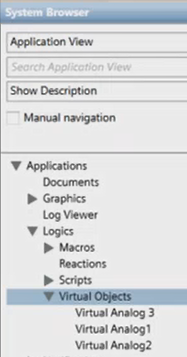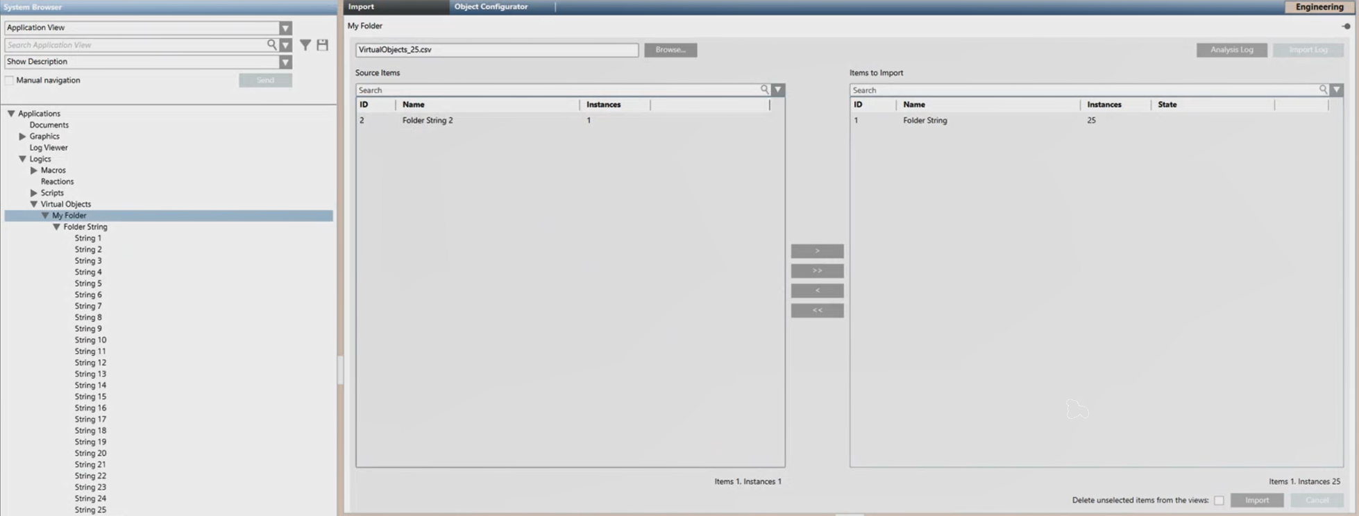 When you are in Engineering mode and select Virtual Objects or any subfolder under it in Application View of System Browser, the Import tab lets you import the virtual objects included in the CSV configuration file. For instructions, see Configuring Virtual Objects.