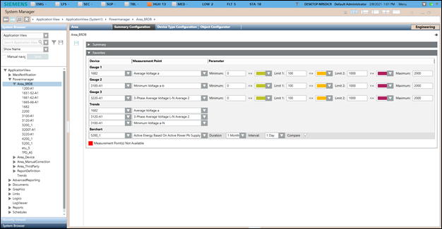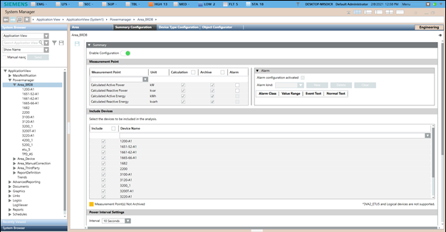 In Engineering mode, when you select any area in Powermanager’s node and, you must first configure the parameters of the Area Summary Configuration tab that displays when the respective area is selected.