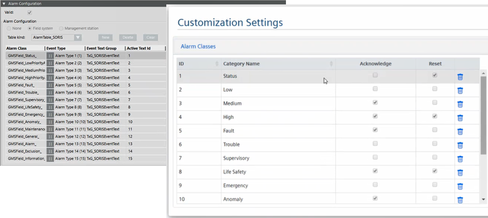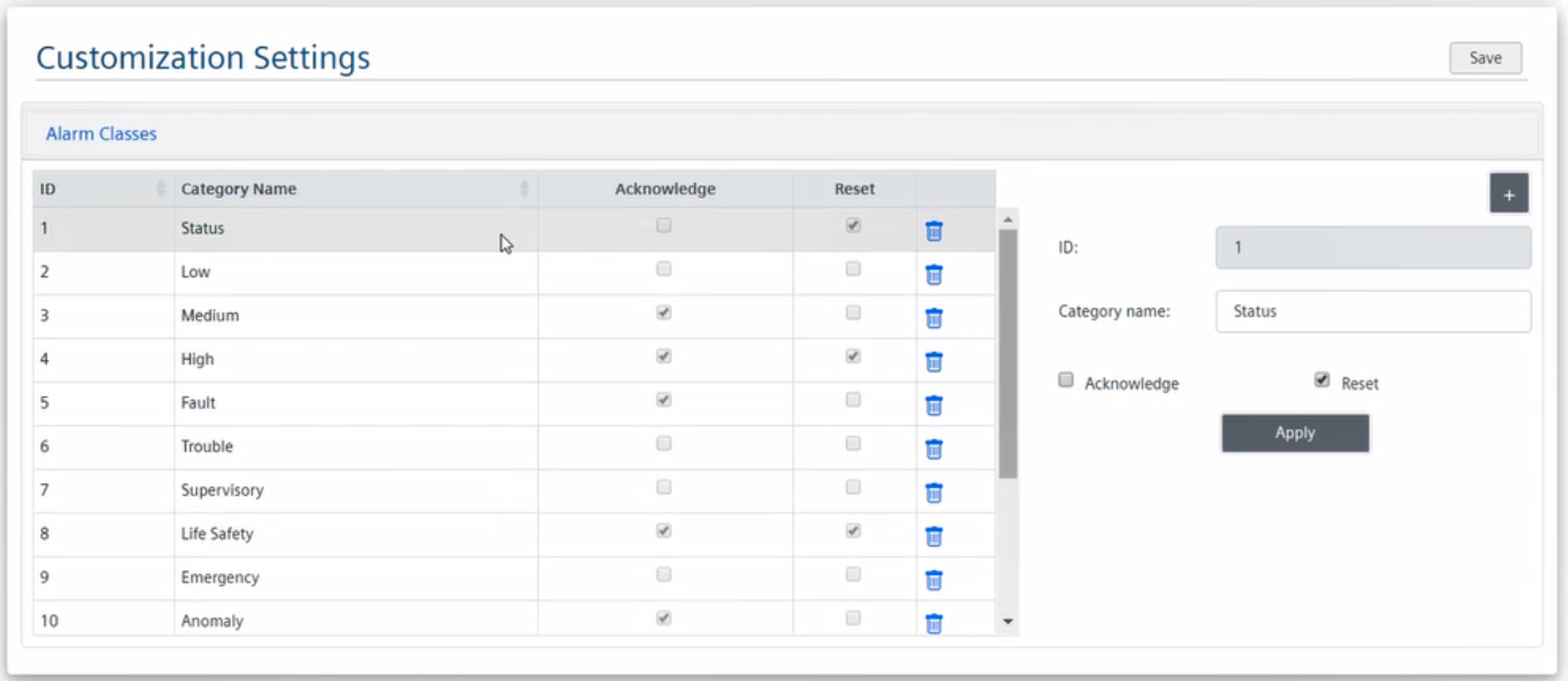 NOTE: ID is a unique value that cannot be modified. Furthermore, the alarm class customization settings must match exactly the configuration of the customized alarm table in Desigo CC.