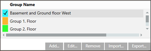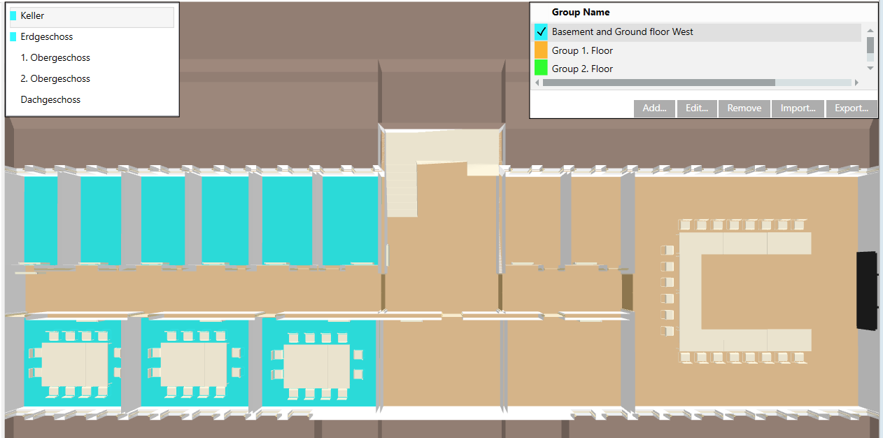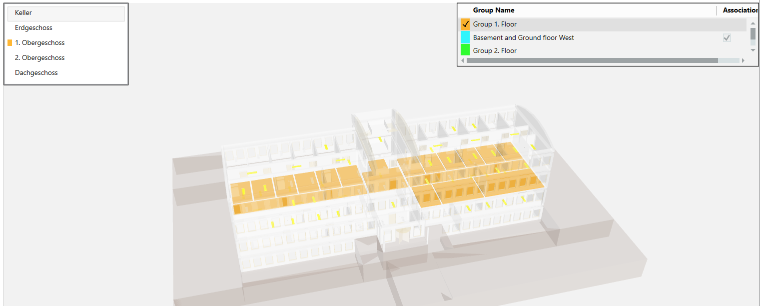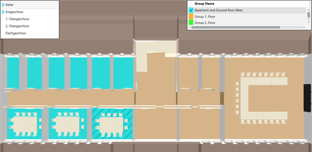 . When shown, the floor list highlights groups in color that extend beyond one floor.