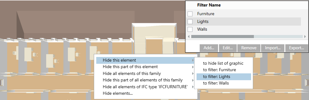 Scenario: After finding the BIM object model for a piece of furniture, all pieces can be hidden belonging to this object.