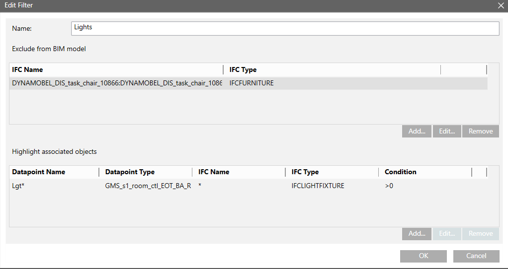 - Displays the associated BIM object. The IFC Name column reference the select furniture object. The BIM object model IFCFURNITURE displays in the IFC Type column. Lighting information is displayed in section Highlight associated objects.