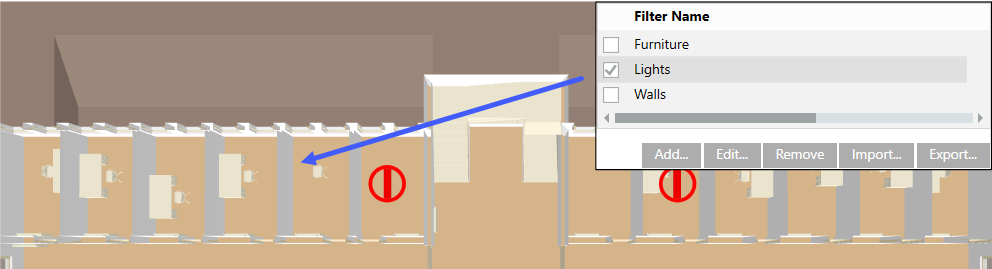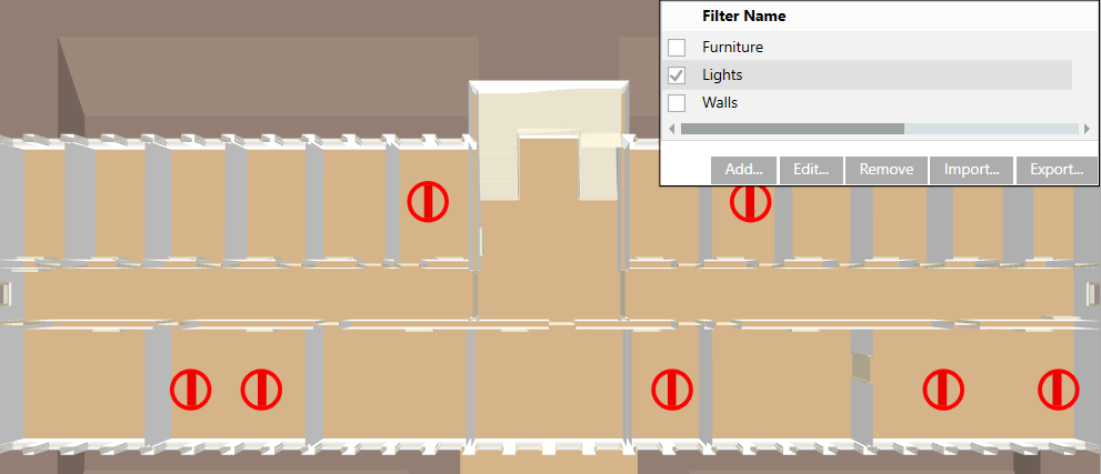 2. Step: Hide all furniture and highlight switched-on lighting objects