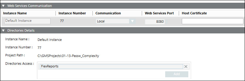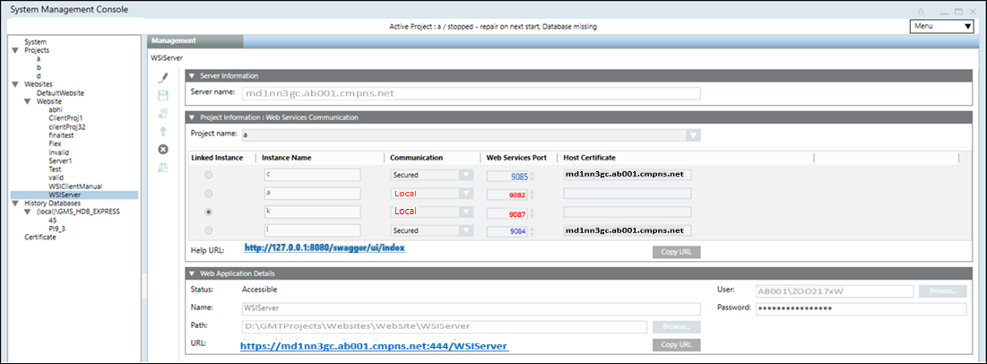 - The Project information: Web Services Communication expander is populated with the information pertaining to the selected project.