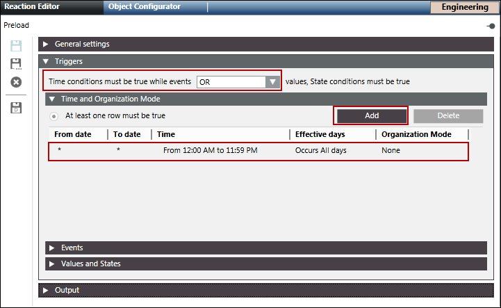 - Open the Time and Organization Mode expander, click Add to add a new time row and leave all default values, or enter a time or schedule that periodically triggers the Reaction.