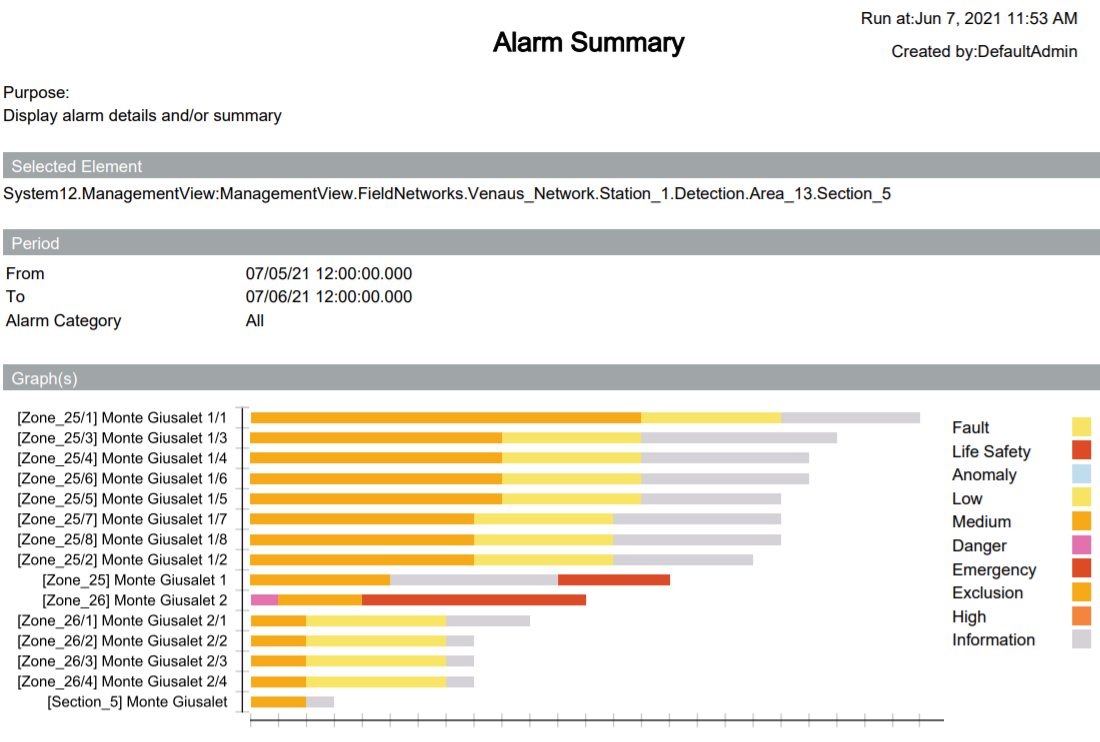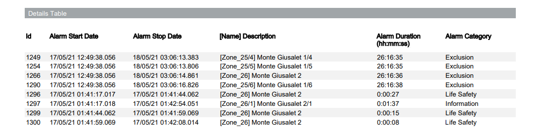 The following images show the content of the PDF export of a typical Alarm Summary report.