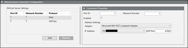 Selecting BACnet Server in System Browser allows you to add a network connection to the management platform and configure the connection properties.