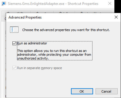 - Right-click Siemens.Gms.EnlightedAdapter.exe – Shortcut and the select Properties in the menu.