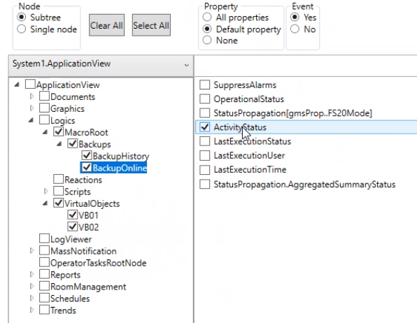 - For the specified object selection, from the list of properties to the right of the tree view, select the check boxes that correspond to the object properties for which you want to be notified of any status changes.