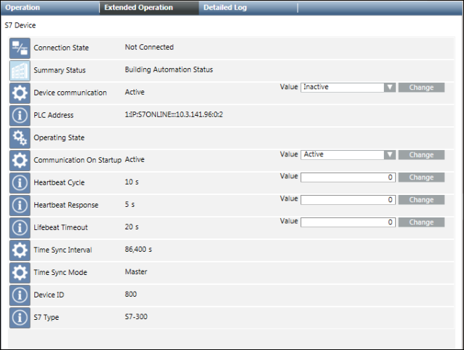 This expander displays the S7 device data settings. You can view the Device instance (S7 device numeric ID) and Device Name (name of the S7 device) and modify the following parameters: