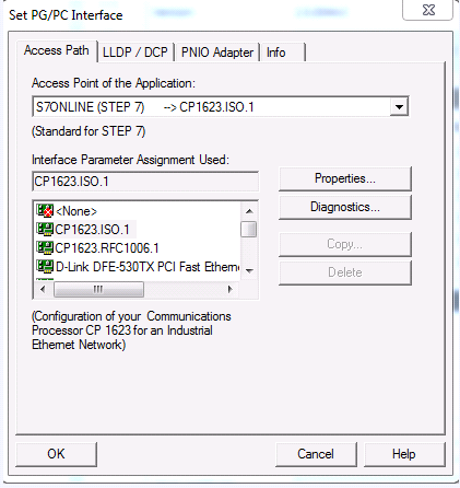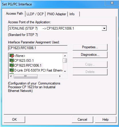 Configure the PG / PC interface in Desigo CC. In the Access Point of the Application drop-down list, select CP1623.RFC1006 if the fault-tolerant connection is configured via IP address (CP443-1EX30, CP443-1GX30, CPU400H-PN).