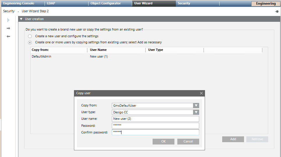 1. If you selected Desigo CC User in the previous step, enter the user Password and re-enter it to confirm.
