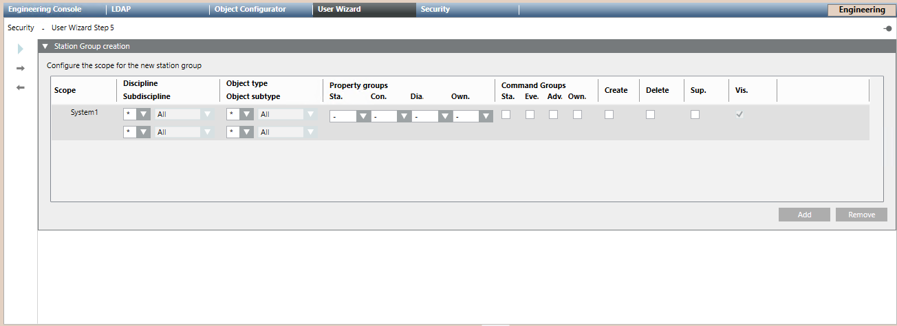 • Under Configure the scope for the new station group, you can configure the scope for the new group. Define the scope rights as: