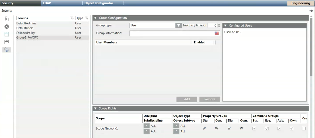 When you configure the settings in the Scope Rights expander, remember to link only the scopes available in the Scopes folder in System Browser. If you try to add a new scope in the Scope Rights expander by clicking the Add button, this results in an invalid configuration (Scope = [name of the system]), and any third-party OPC clients will display an error message when trying to start the connection with Desigo CC OPC DA server.
