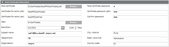 • The data is validated and on successful certificate creation, two new host certificate files, one with an extension .pfx and the other with an extension .cer, are created at the specified location on the disk.