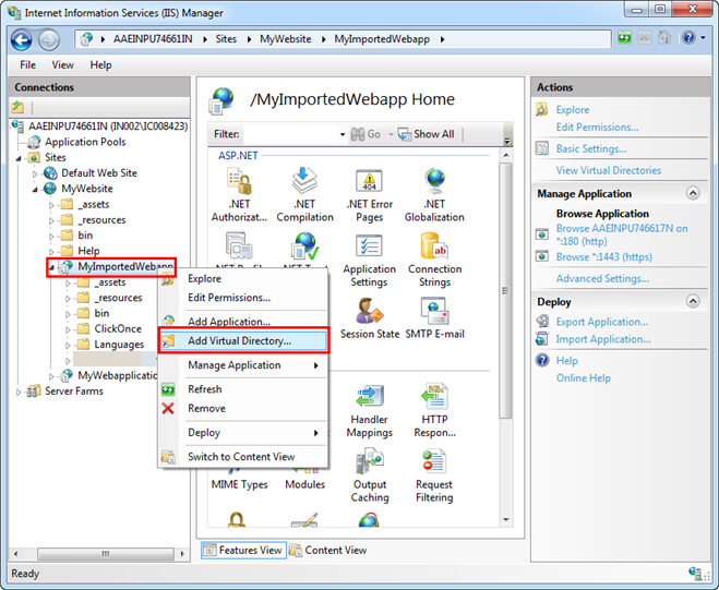 - Select the web application that you have imported and right-click, and select Add Virtual Directory.