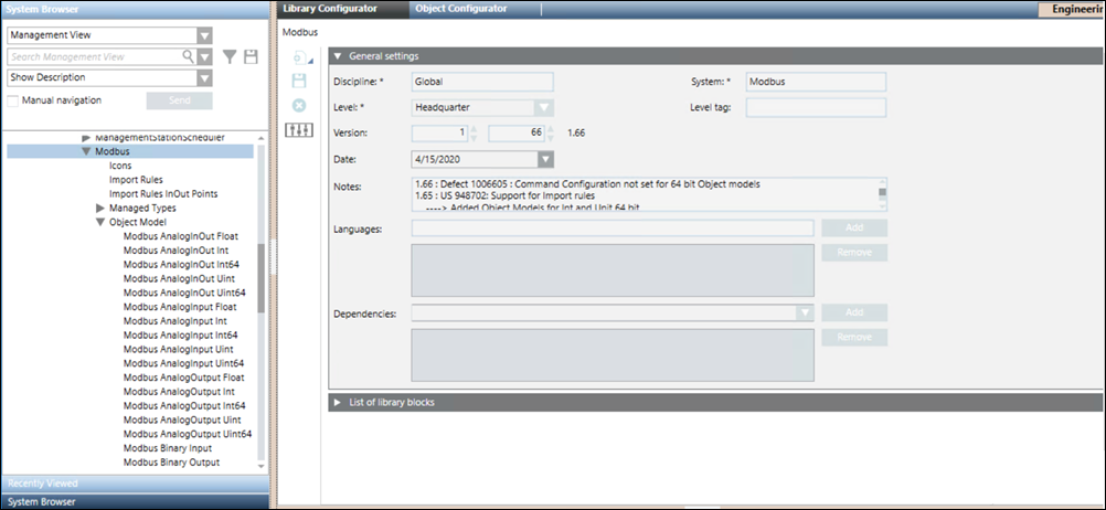 Standard Modbus object models are located at the following location Management View > System Settings > Libraries > L1-Headquarter > Global > Modbus.