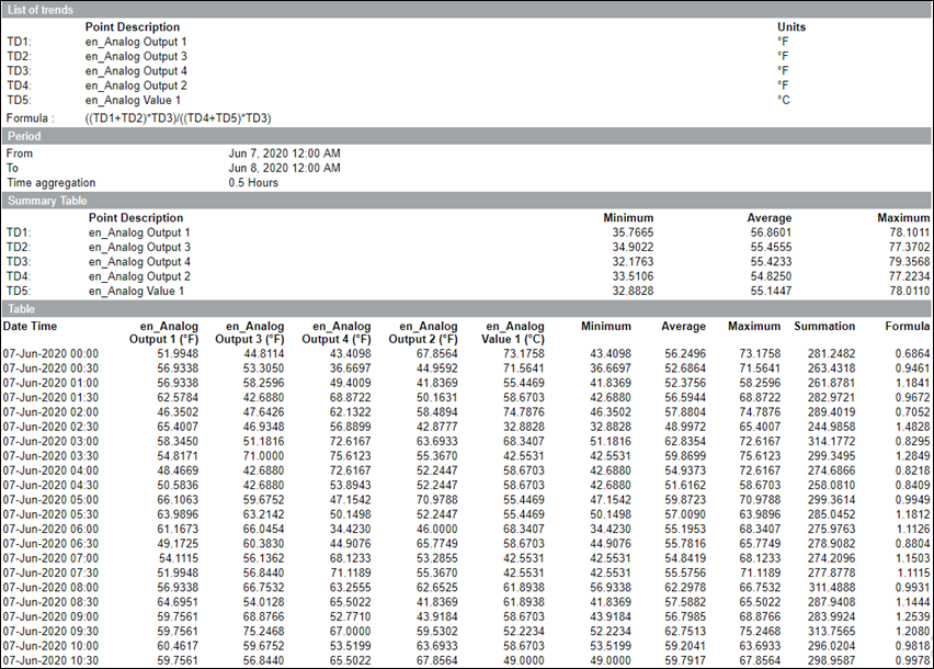 This report is designed to show values of a maximum of 5 different trend log objects, and also displays result of a custom calculation between them. It can be exported in the excel format, and various operations can be performed (for example, creating a chart). The report can be adjusted with different values to be specified in the Parameter dialog box, to allow the most frequent report content.