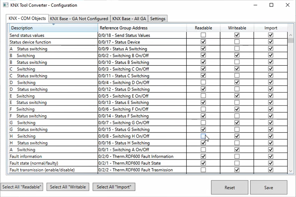 NOTE: To set to readable all the KNX COM objects included in the configuration file, click Select All “Readable”.