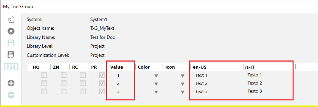 The following image shows the corresponding fields in the Text Group Editor tab: