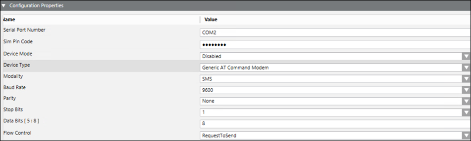 1. In the Configuration Properties expander, proceed as follows (For more information refer to the GSM Modem Device section in Notification Supported HW/SW Device Configurations Guide):