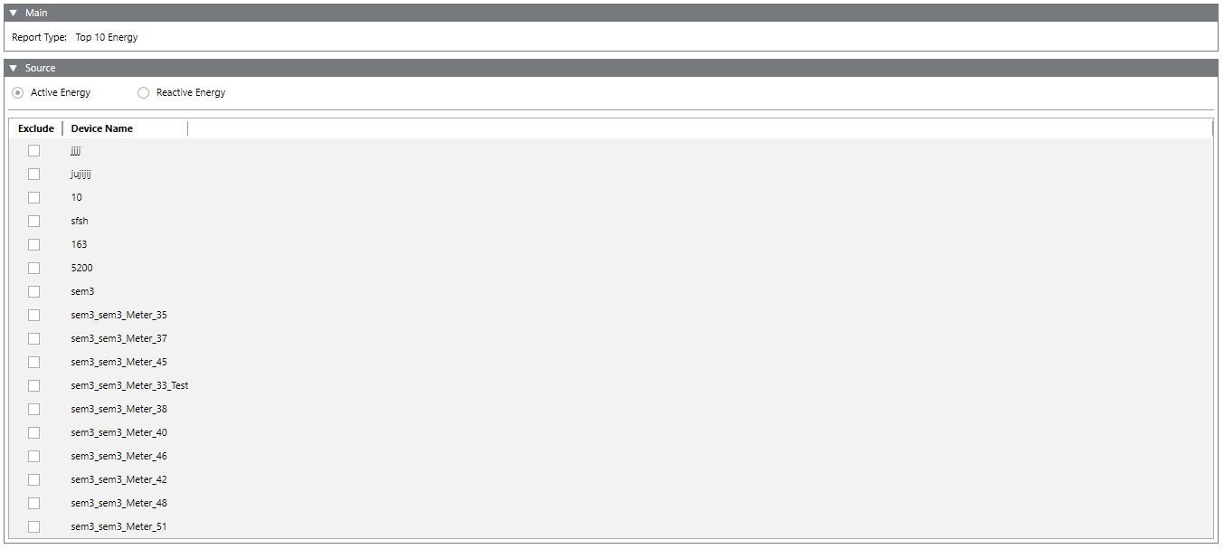 1. From the Source expander select either Active Energy or Reactive Energy to display the respective value for the top 10 devices.