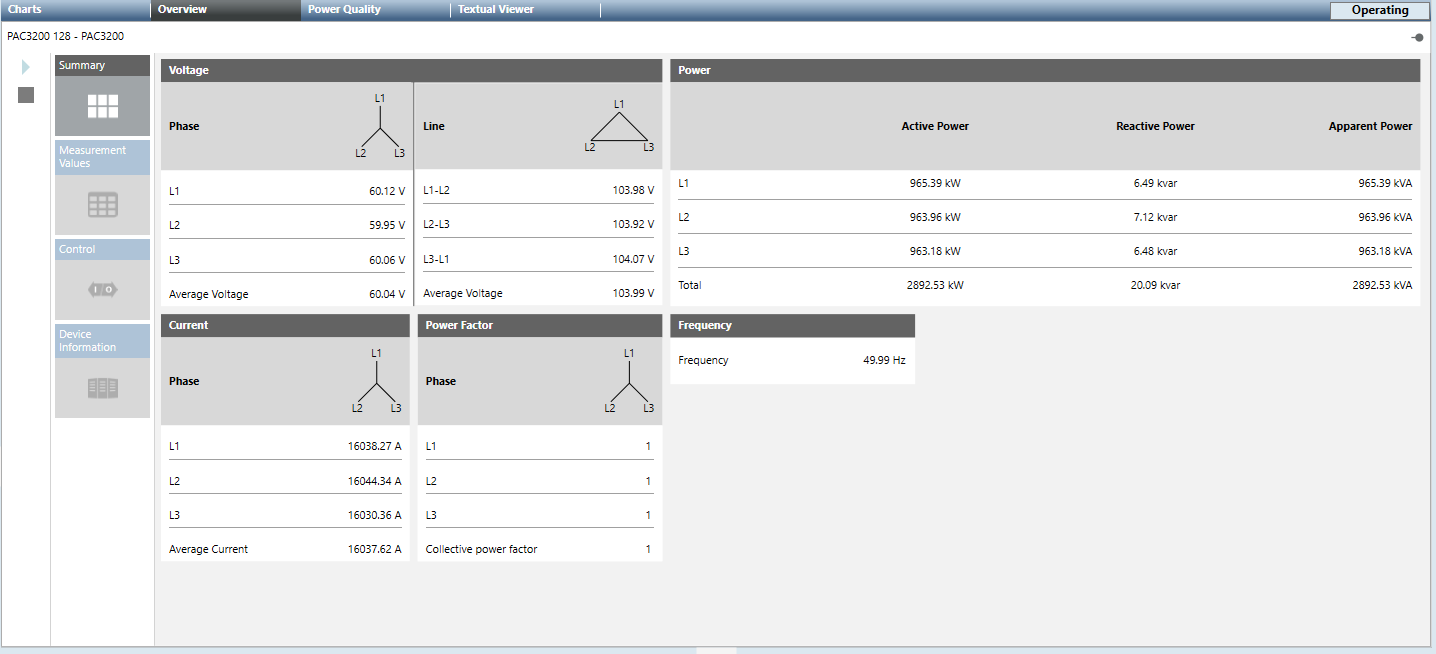 - Summary: Displays the real-time values for Voltage, Power, Current, Power Factor and Frequency.
