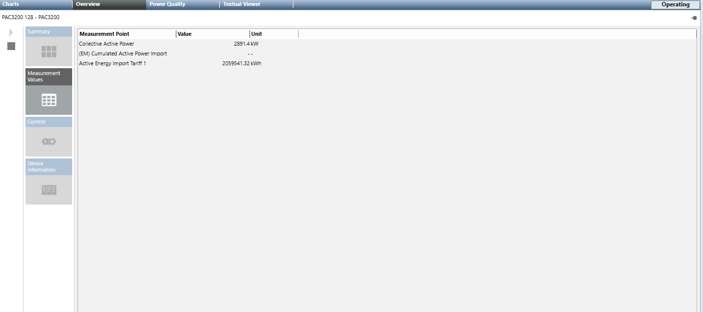 - Measurement Values: When selected, this tile displays the preconfigured measurement points of the selected device with description, current measured value, and defined unit.