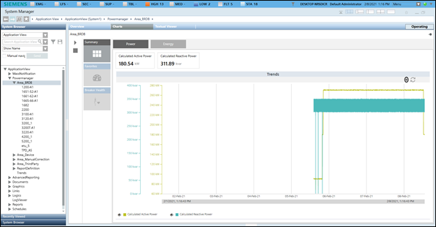 - Power (default): Displays the Calculated Active Power and Calculated Reactive Power summary chart.