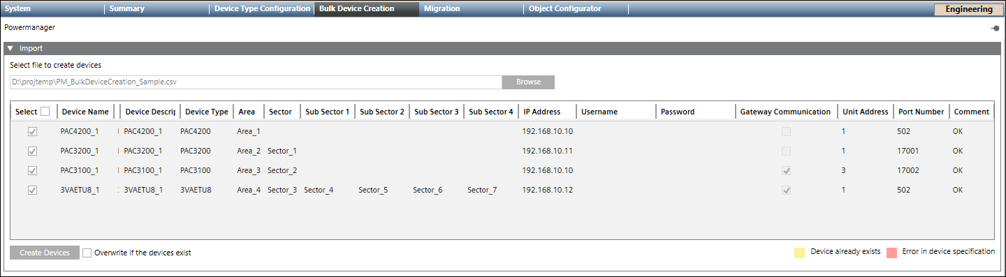 NOTE: If the device is already present in the system, it is highlighted in yellow. If there is an error in the device specification, the device is highlighted in red.