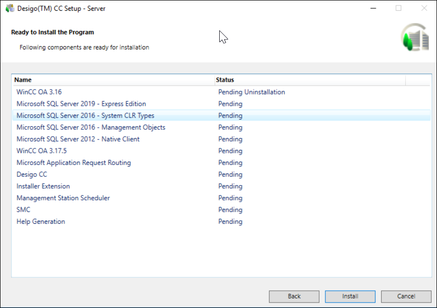 1. The Ready to Install the Program dialog box that displays listing the status of the prerequisites, Desigo CC installation (platform + mandatory extensions), platform patch, non-mandatory extensions, mandatory extension patches, non-mandatory extension patches, help merging status, and the status of the post-installation steps selected for execution during the upgrade process.