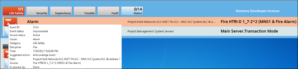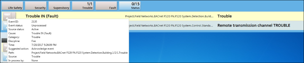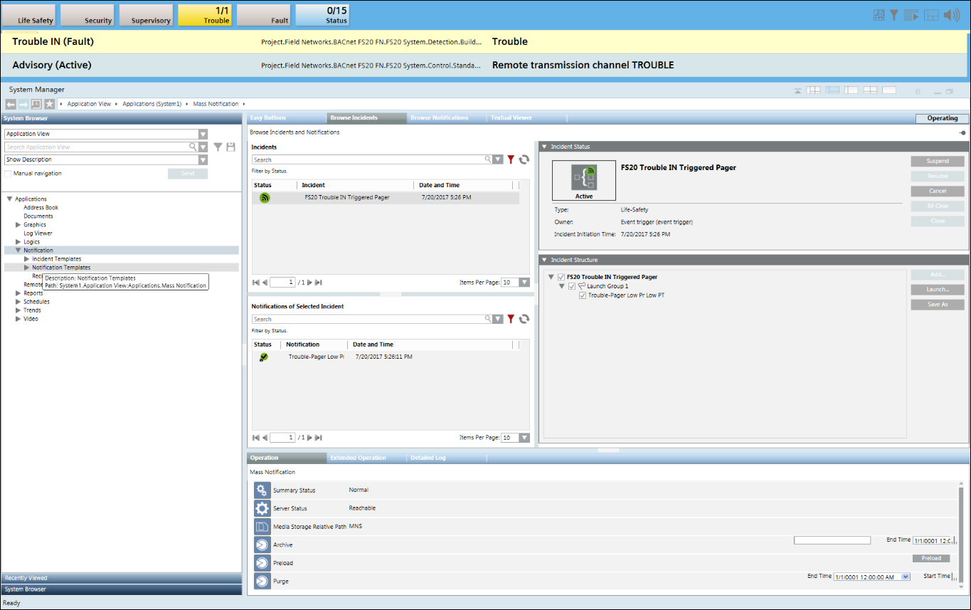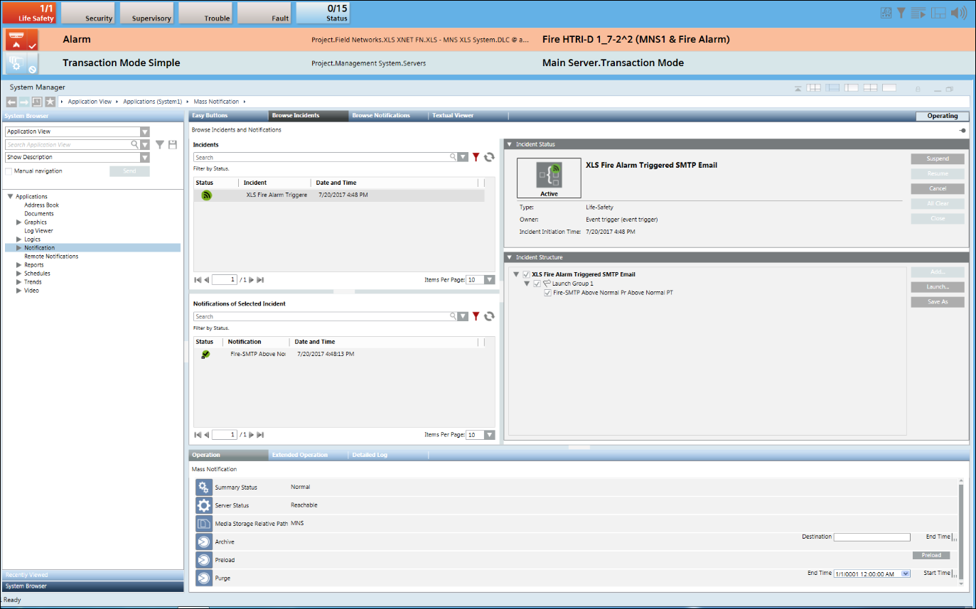 1. When an event from the BACnet or Xnet interface is generated, the incident you created in step 4 (Incident_BACnet or Incident_Xnet) is initiated and can be verified from the Browse Incidents tab by selecting Applications > Notification > Browse Incidents.