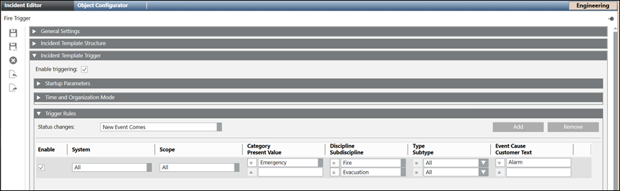 1. Select the Enable check box and configure the parameters. For information, see Incident Template Trigger Expander.
